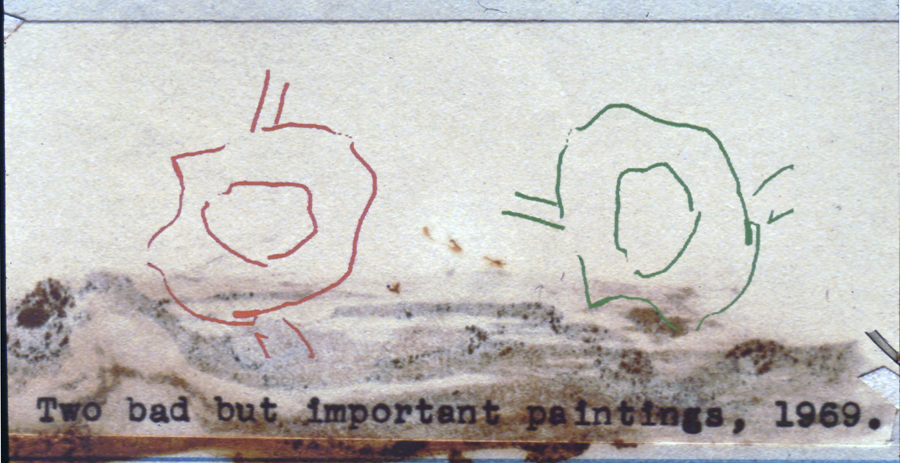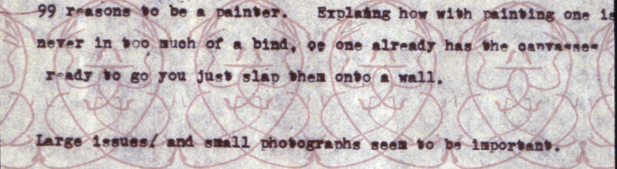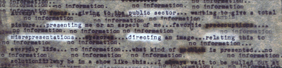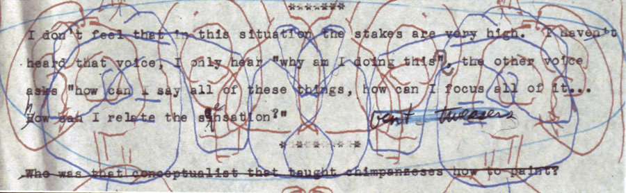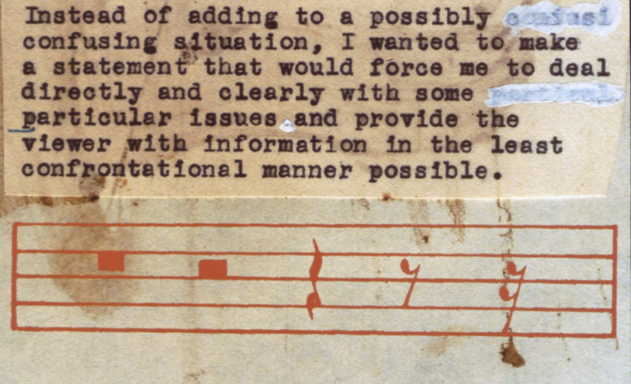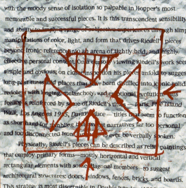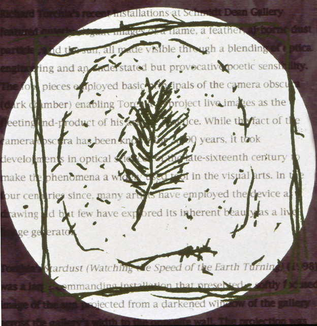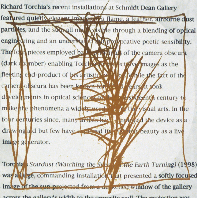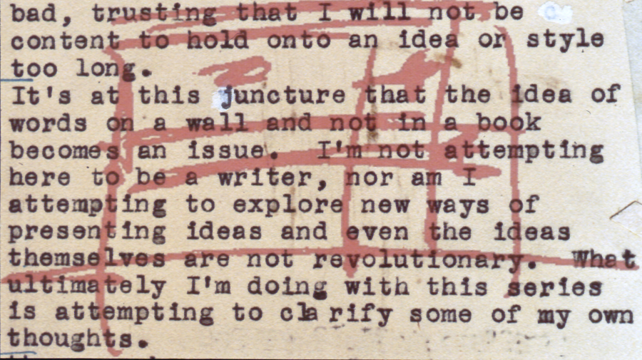 Corpus Callosum (2001-03) digitally merges fragments of text and diagrams culled from years of notes and drafts that served as background for articles and reviews written for various publications. While the words and images in each piece are directly related to the same idea, they offer evidence of the complexity involved in transforming ideas into transferable form. Original notes date from the 70s through the 90s.