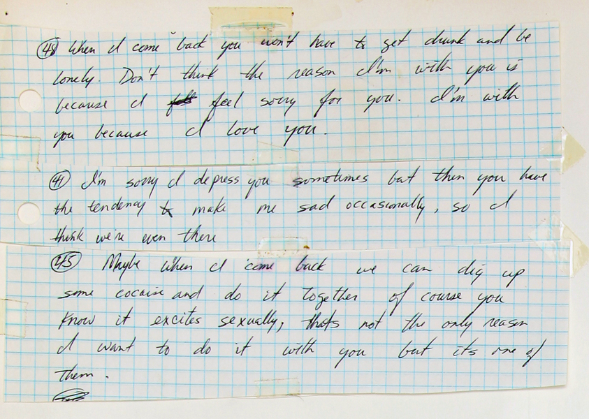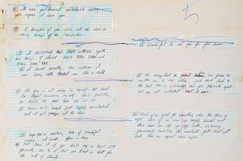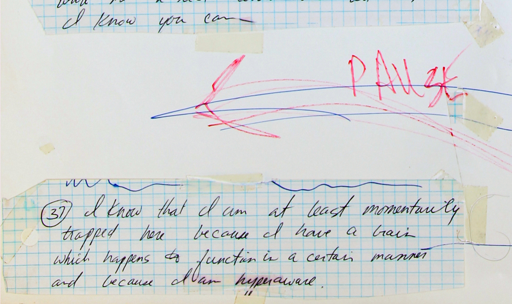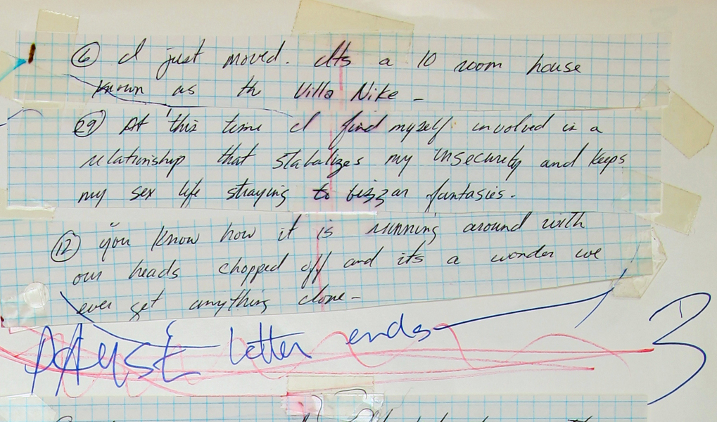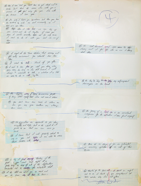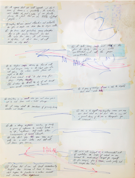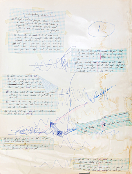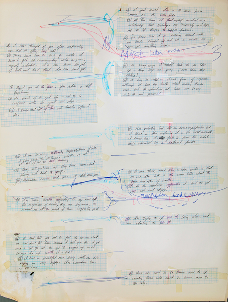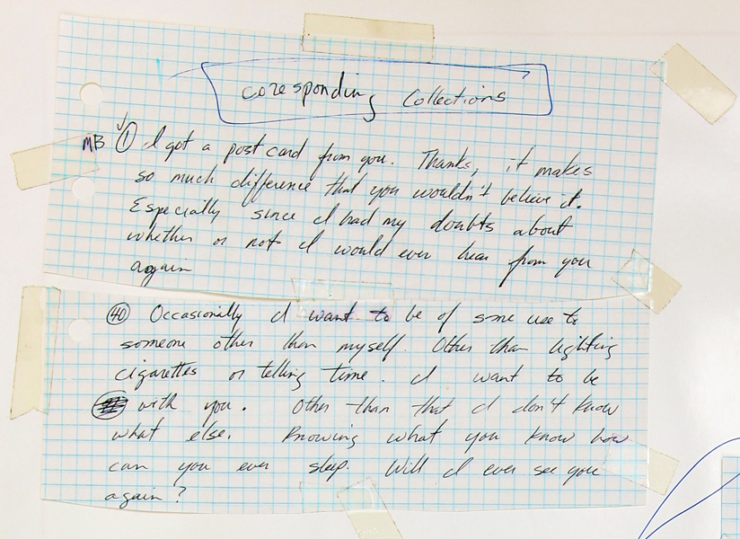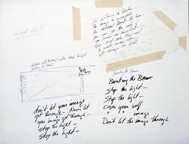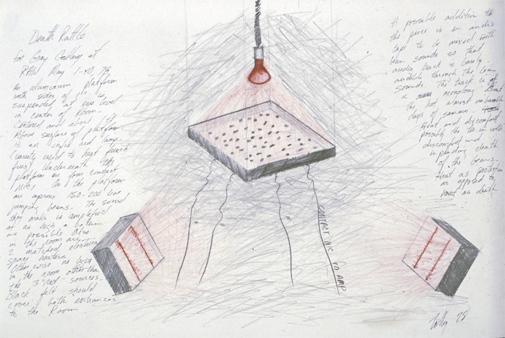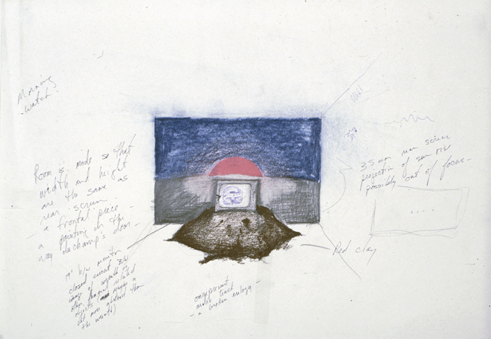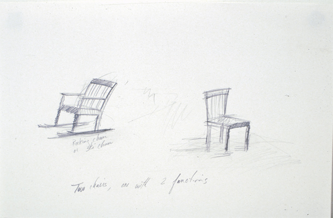 Corresponding Collections (1978) was an audio and slide installation presented at Real Art Ways Gallery, Hartford (CT). Images here depict preparatory drawings associated with this project. The final RAW installation included a two-channel audiotape with a back-and-forth dialogue spoken by a male (channel one) and female (channel two) with slight southern accents. An 80-image slide carousel projected images of my face onto the gallery wall. Text for the audio was excerpted from personal correspondence. Three of the images here, Death Rattle, Mourning Watch, and Two Chairs —— One with Two Functions, were alternate concepts for the installation’s visual elements