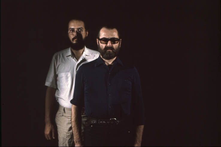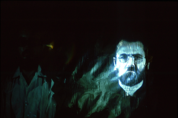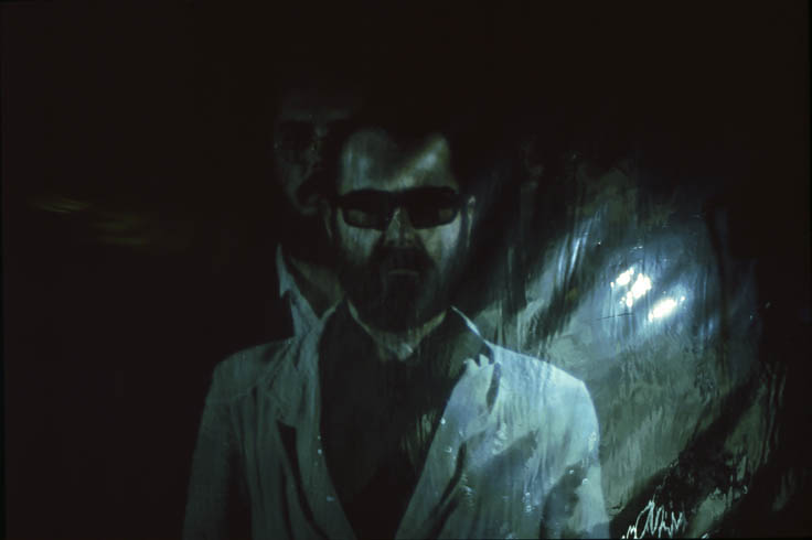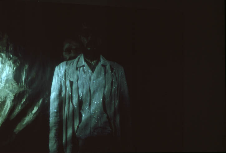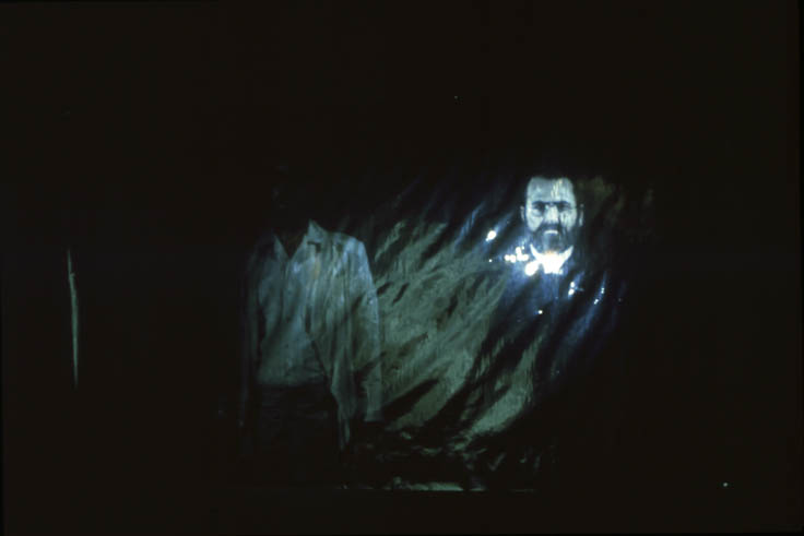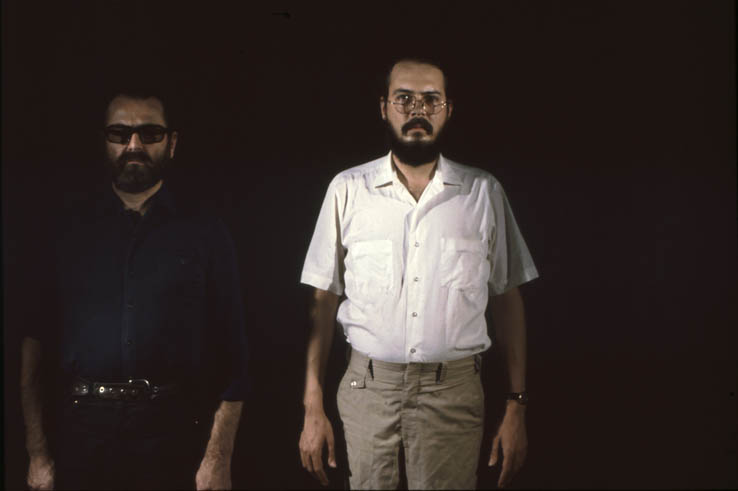 We made a series of slides “orbiting” each other, often with articles of clothing and personal effects—jackets, eye glasses, and wrist watches—exchanged between shots so that we visually merged our outer appearances. The slides were projected onto mirrored mylar, further blurring our physical images and reflecting “our light” into the gallery, thus constantly modulating and “filling” the space. Simultaneously, loudspeakers in opposite ends of the room played tape loops of us recounting our recollections of each day of the process. Our often-contradictory accounts of various meetings highlighted the illusiveness of memory, personal aesthetics, and language.
