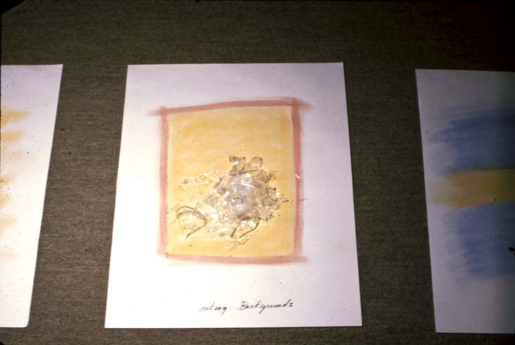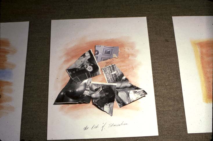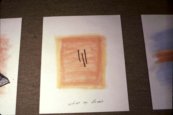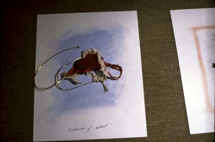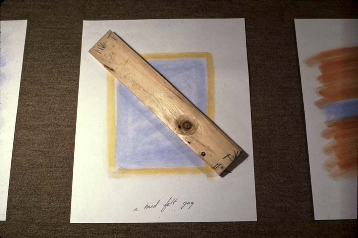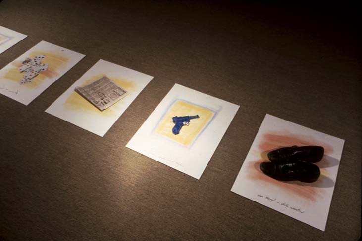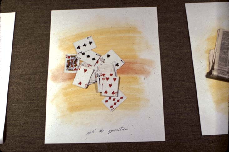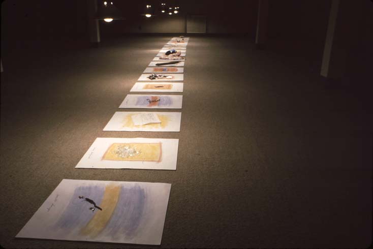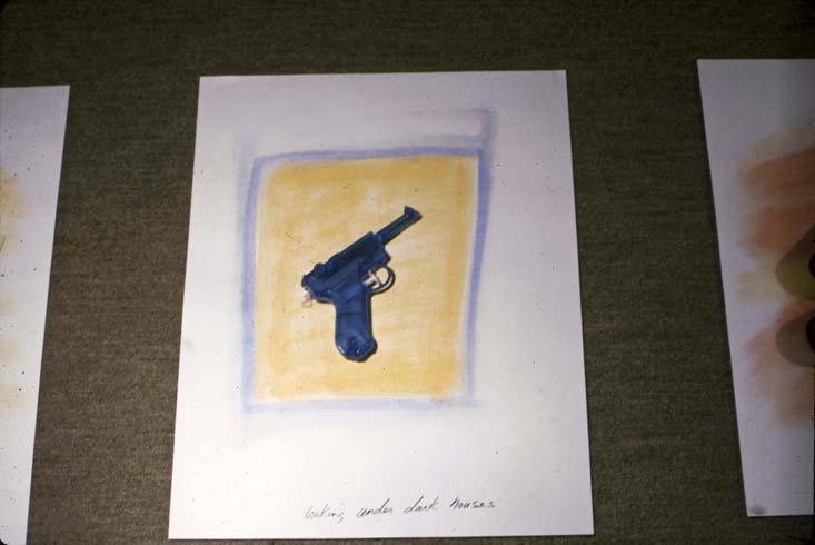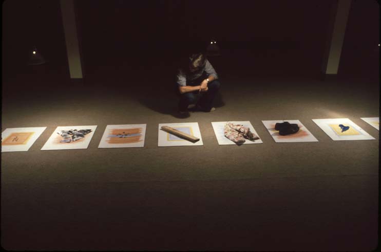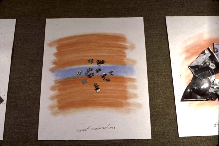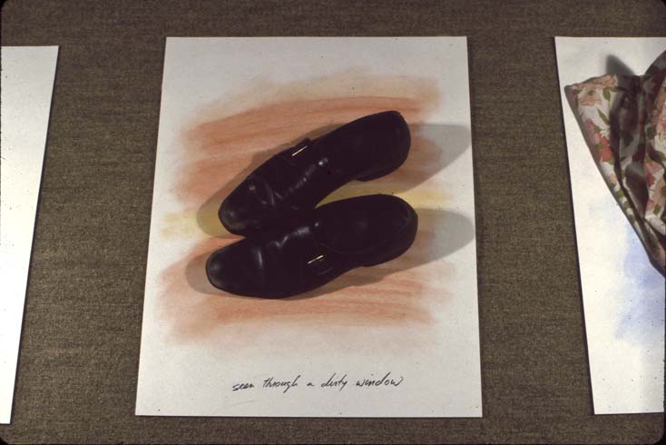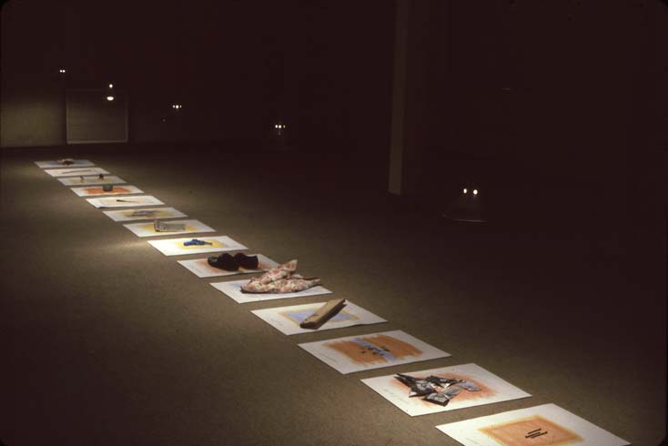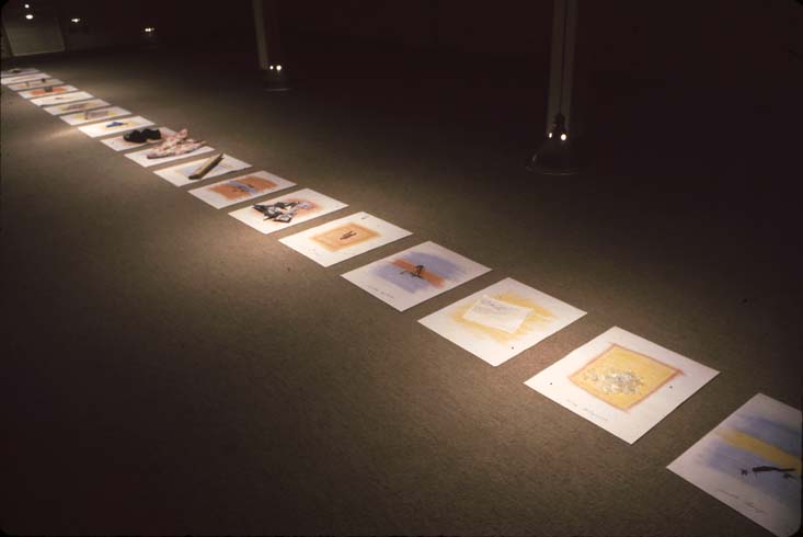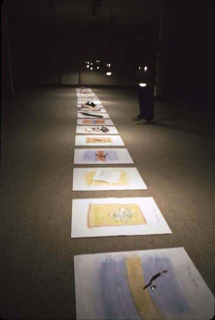 Factories and Roses (1978) was presented as an installation of drawings, objects, custom lighting, and two-channel audio at the Moon Gallery, Berry College, Mt. Berry (GA). Assorted objects sat atop 20 abstract pastel drawings that were inscribed with inked text. The drawings were placed on the floor and illuminated by a row of suspended, low-wattage lamps.