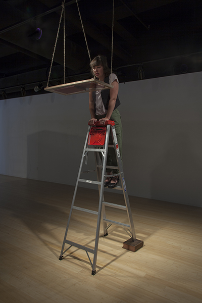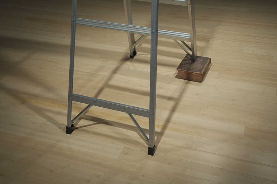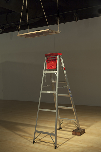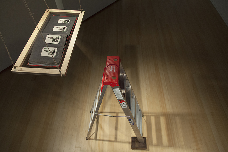 The bottom of the suspended platform was clear, enabling viewers to see the cover of the photo album, but they had to ascend the impaired ladder to see its contents. About every 45 seconds, a hidden audio system played a loop of a person climbing an aluminum ladder, losing balance, and falling to the floor with a “thud.” The intrepid viewer who climbed was informed, on the final page of the album, that “Uncle Hue” died after falling from a six-foot ladder, while changing a light bulb.