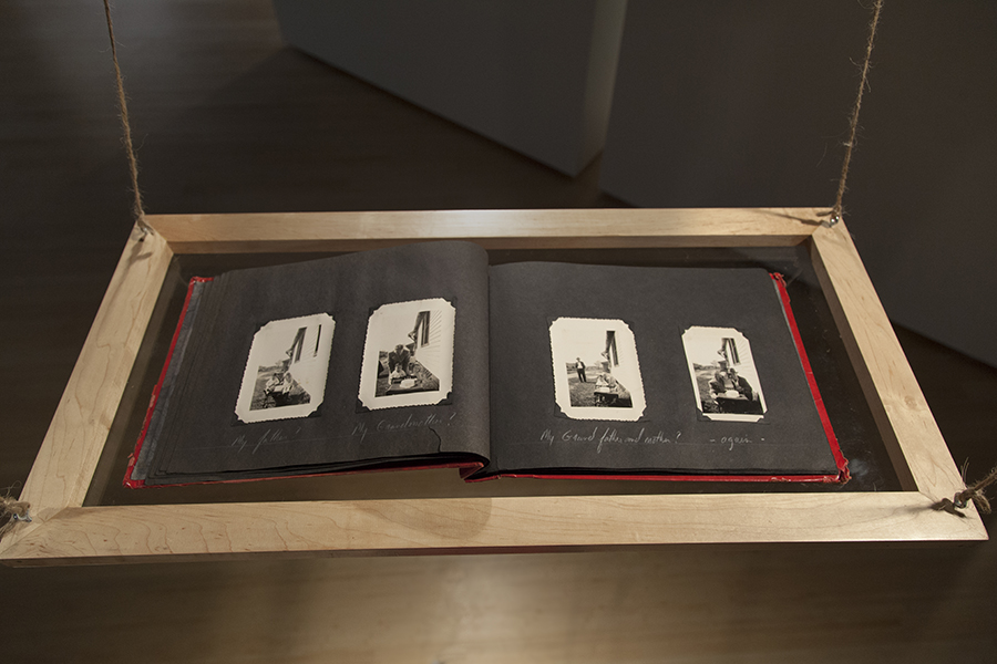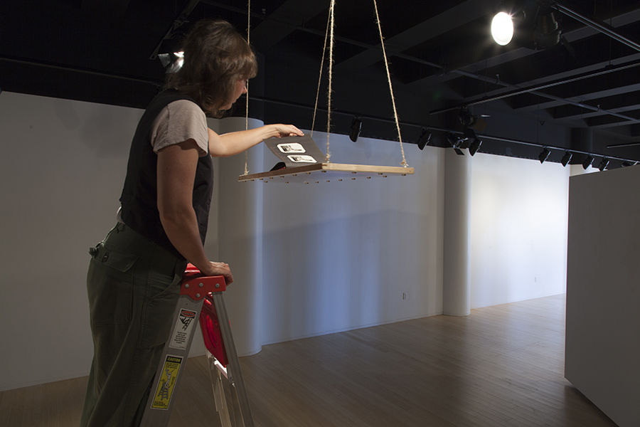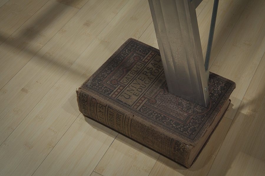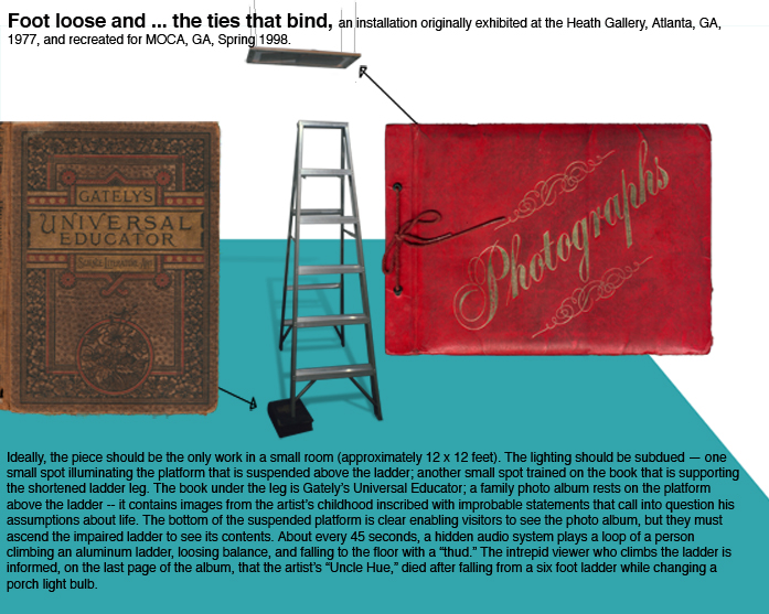 Footloose and … the ties that bind (1977) was installed at the Heath Gallery in Atlanta and at the Museum of Contemporary Art, Georgia, also in Atlanta (2002). The installation required a small room (approximately 12 by 12 feet). The lighting was subdued with one spotlight illuminating a small platform suspended about 18 inches above and slightly in front of the ladder’s top. Another spotlight illuminated a leg of the ladder that had been shortened and was resting on a copy of Gateley’s Universal Educator (1883). A family photo album placed on the platform above the ladder contained images from the artist’s life inscribed with improbable statements that called into question life’s assumptions.