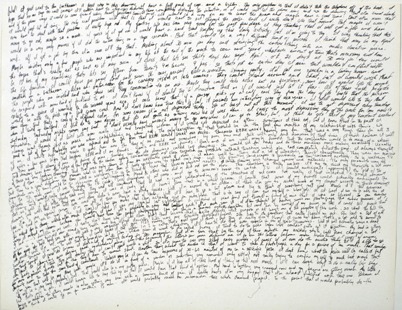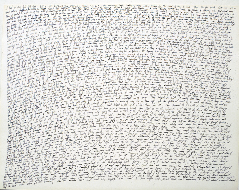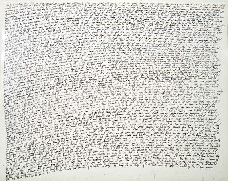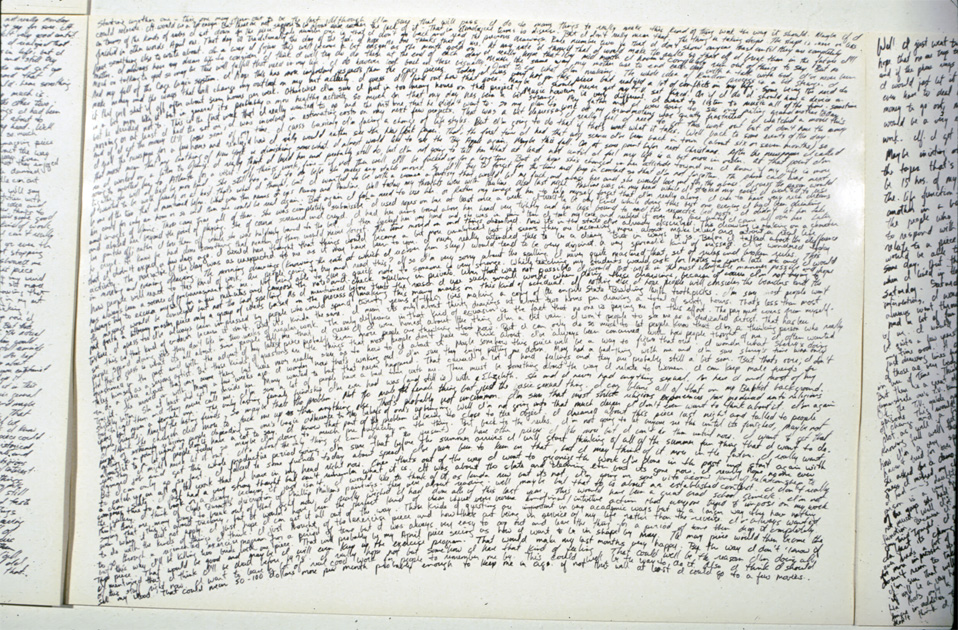 March Series (1978) included 31 drawings arranged in a 5-row by 7-column grid, push-pinned to a gallery wall. Each day for a month, I filled a page of 18-by-24-inch drawing paper with nonstop writing in my normal handwriting size and style. Each would take several hours to complete and content quickly became an issue because the “nonstop” aspect was central to the concept of “passing time.”