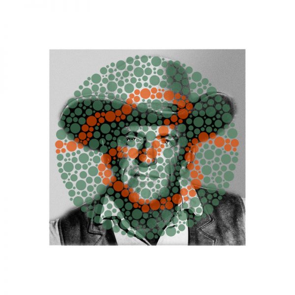 The Trouble with Cowboys grew out of my father’s love of movies and television programs about the early days of the American West. He had protanopia, a type of color-blindness that affected the green-yellow-red portion of the visual spectrum. Because of the disorder, he preferred black and white TV and films to color because, to him, they presented a more believable representation. The plot lines of popular Westerns were generally simple tales about good and evil, usually represented by men in white and black hats. These American morality plays became even less nuanced when Native Americans were included. Often depicted as the aggressor, the “red man” stood in the way of the “white man’s” God-given right to all the lands within and just beyond the newly formed “United States of America.” Images of the rugged men of the West, as embodied and enshrined by Hollywood, were a constant feature of life in the 1950s. Ubiquitous publicity stills were offered as distillations of all that was good and righteous in America. The oversimplification of good vs. evil, right vs. wrong, and monochrome clarity vs. color complexity underpins The Trouble with Cowboys. There’s also an obvious element of homage to the work of John Baldessari and an affectionate remembrance of my Dad.