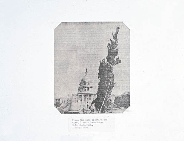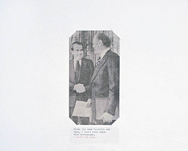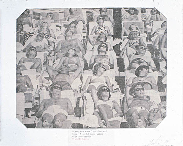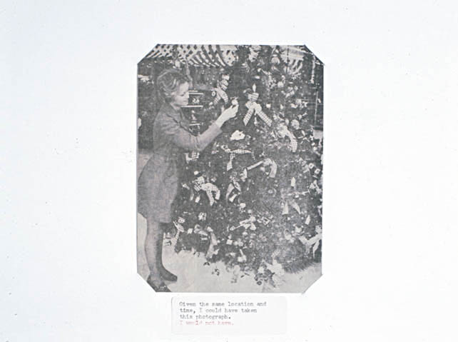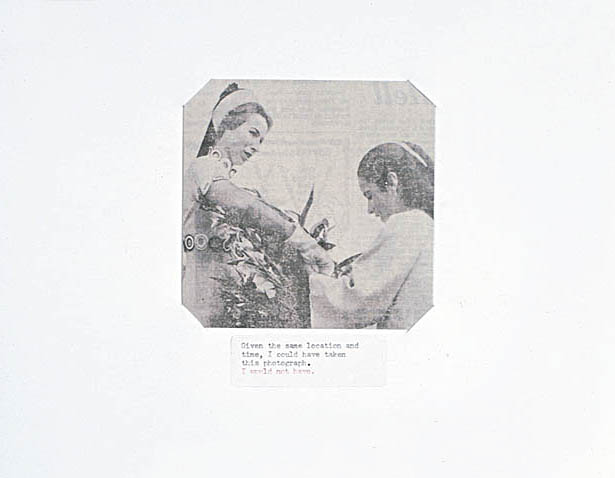 Would have taken / Would not have taken (1974) is a small series utilizing appropriated photographs from daily newspapers. A typewritten tag on each image states: “Given the same location and time, I could have taken this photograph.” And depending on aspects of the image, the text continues “I would have” or “I would not have.” The work highlights the multiplicity of considerations that constitute “quality,” particularly when approached from a journalistic context as opposed to an “aesthetic” one.